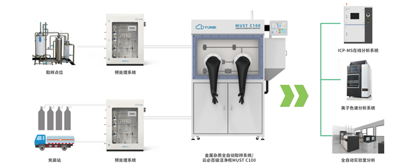 可直接安装在生产现场,实现百级洁净环境下的自动在线取样,解决传统离线取样的样品损耗、污染、延迟与吸附问题,取样后样品可无损转移至ICP-MS(金属杂质)、离子色谱仪(氯杂质)分析模块,实现金属杂质与氯杂质的超高精度检测,避免转运过程中的二次污染与样品失真。